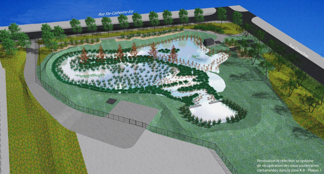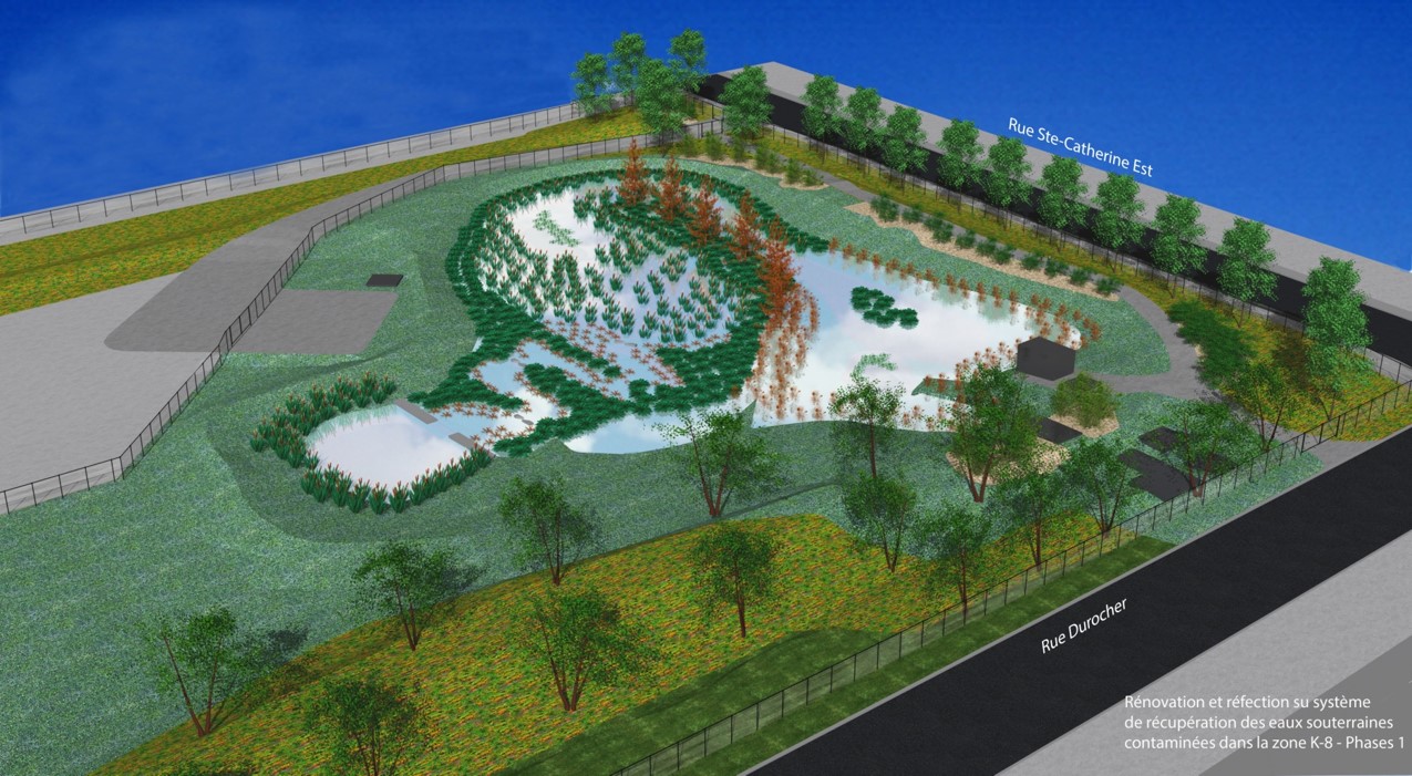 Le projet K-8 comprend la récupération des eaux contaminées souterraines qui seront ensuite traitées, notamment par phytoremédiation à l’emplacement du secteur délimité par la rue Sainte-Catherine Est, l’avenue Durocher et le boul. Montréal-Est.